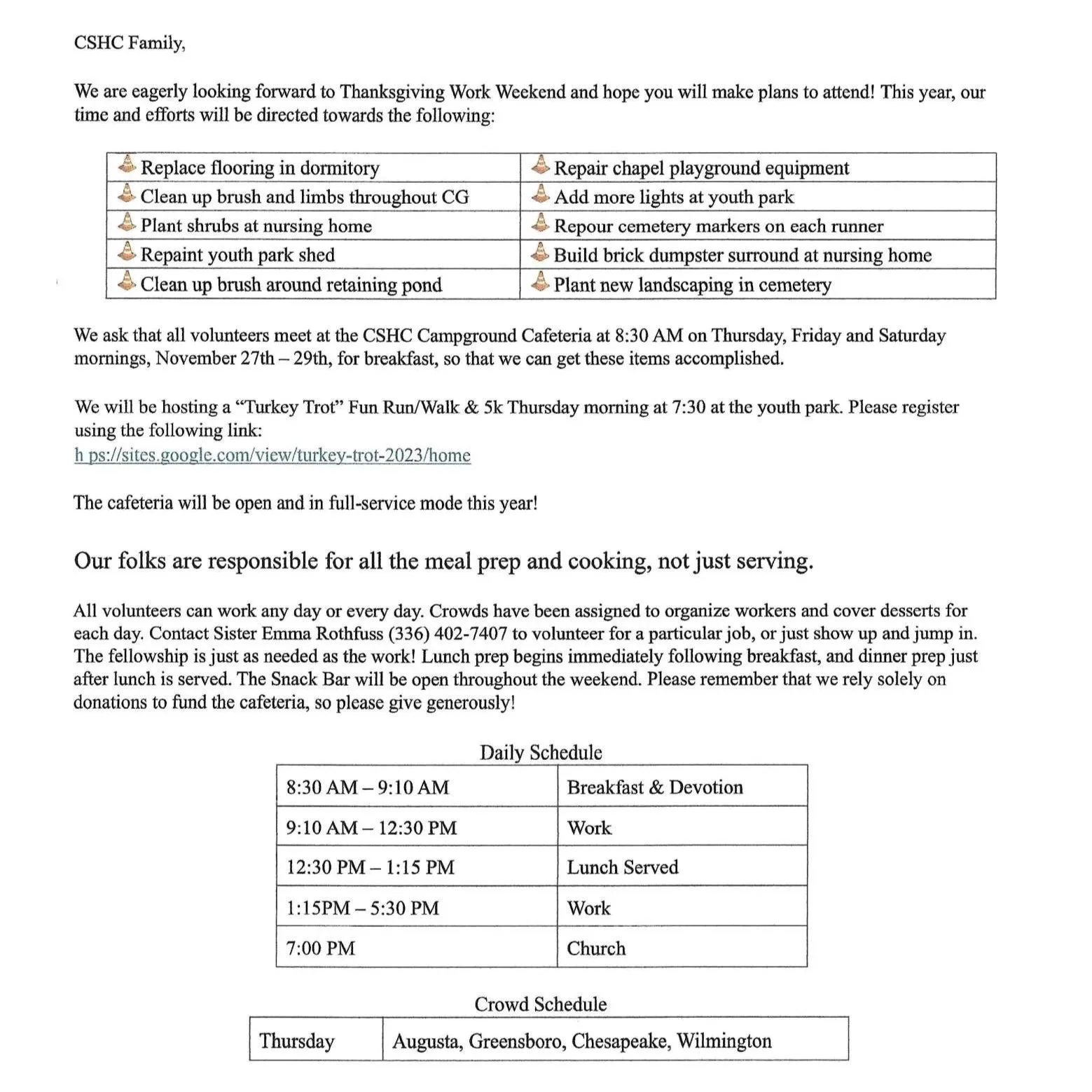Thanksgiving Work Weekend Nov. 27 - 29, 2025